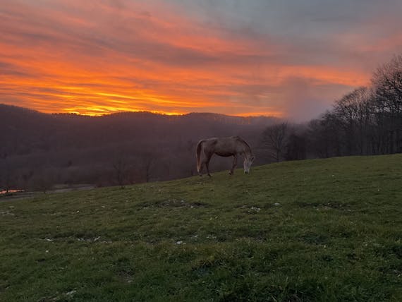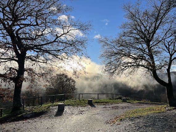 When the fog lifts, the beech forest with thousands and thousands of thinned tree crowns stretches over the mountain ridges down into the valley. On rare days, the lush green pasture contrasts with the cloudless, clear blue of the sky. Sunsets, like a greeting from distant worlds, await us on these days. A spectacle of light, clouds and colours that glow just before darkness and finally go out in it.