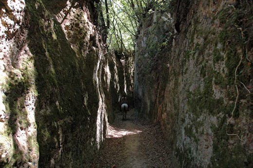 On the three days trail we will ride through beech woods, Etruscan Necropolis, Etruscan roads "Vie Cave" cut deep in the tuff rock more than 2000 years ago, Etruscan villages, hills, and beautiful countryside.